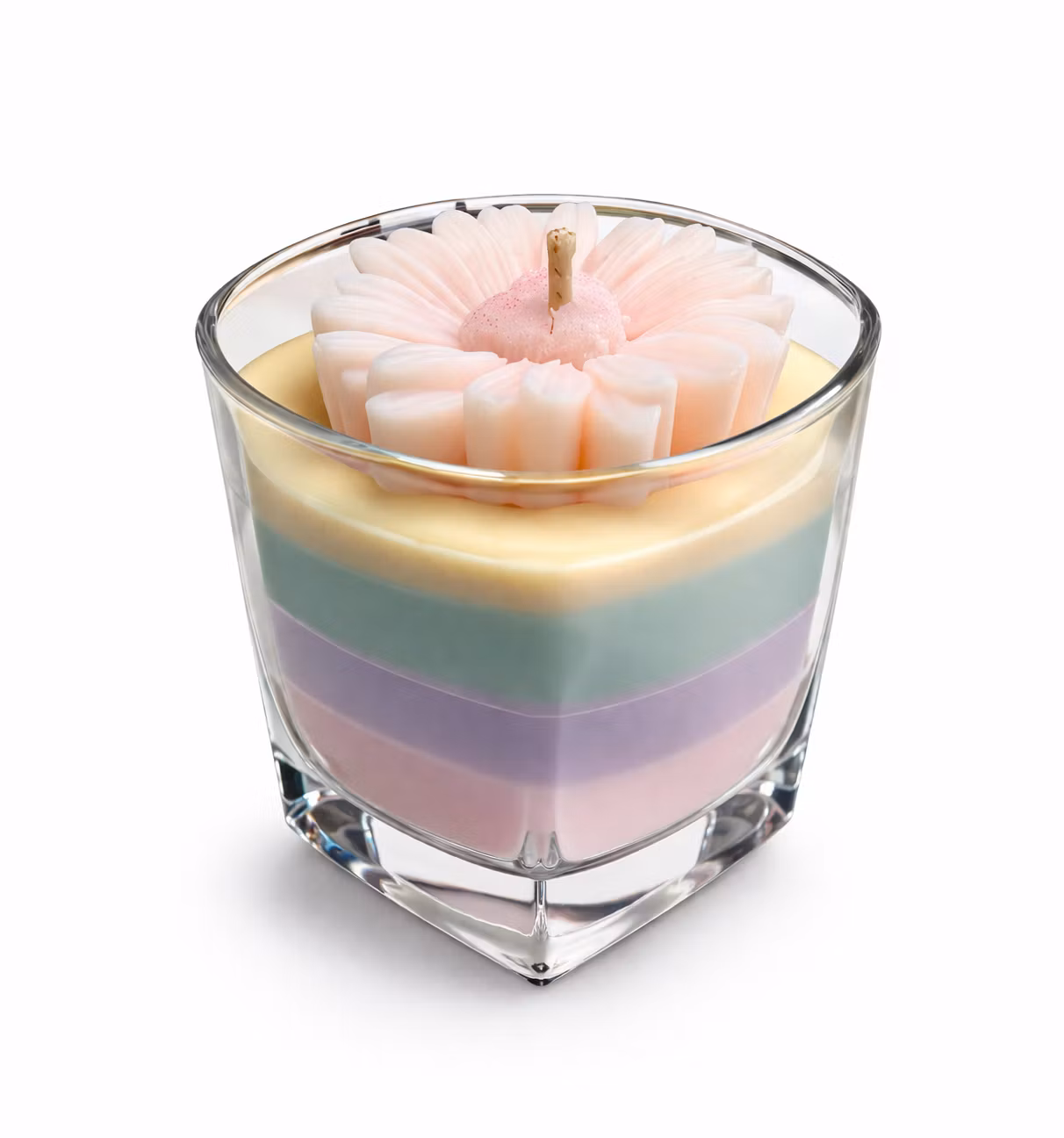 Sojavax ljus i fint glas. Färgerna är i vackra sommarpasteller.