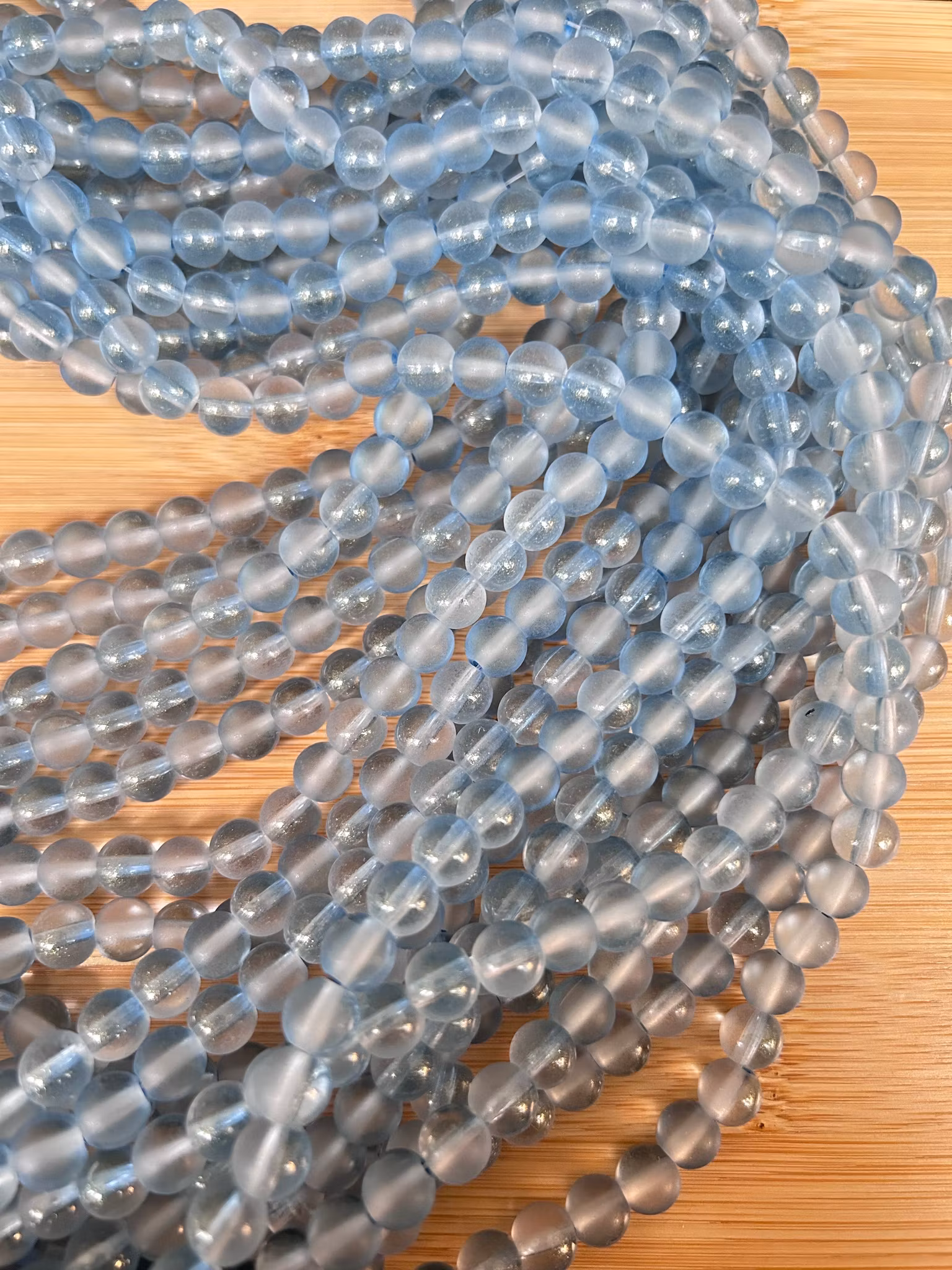 Dessa glaspärlor, med en fascinerande stålblå nyans, fångar ljuset på ett sätt som skapar ett subtilt, men ändå förtrollande skimmer. Den frostade ytan ger en mjuk och lyxig känsla, medan den transparenta finishen tillför en dimension av djup och klarhet.