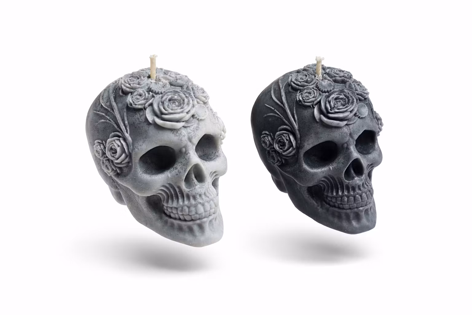 Döskalle i sojavax, grå med lite glitter i. Storlek 8,5x 9,8cm.