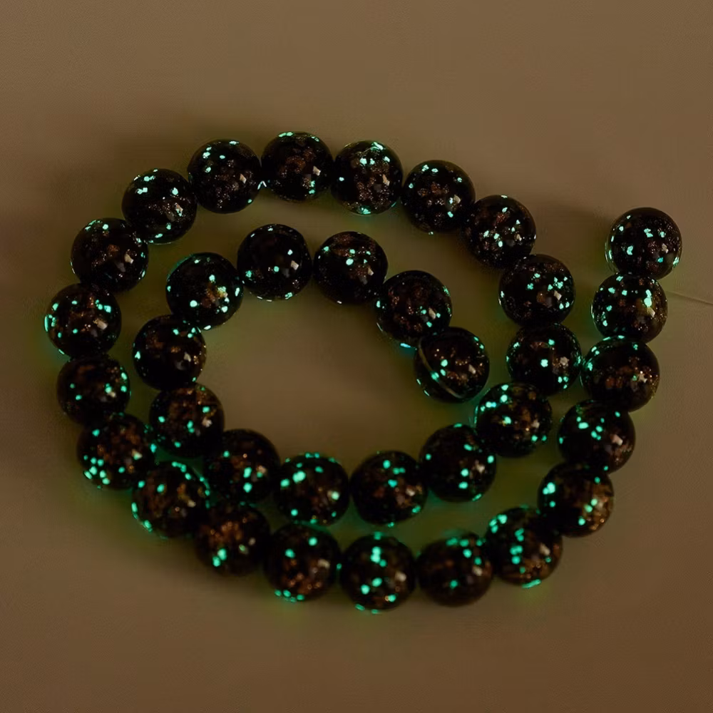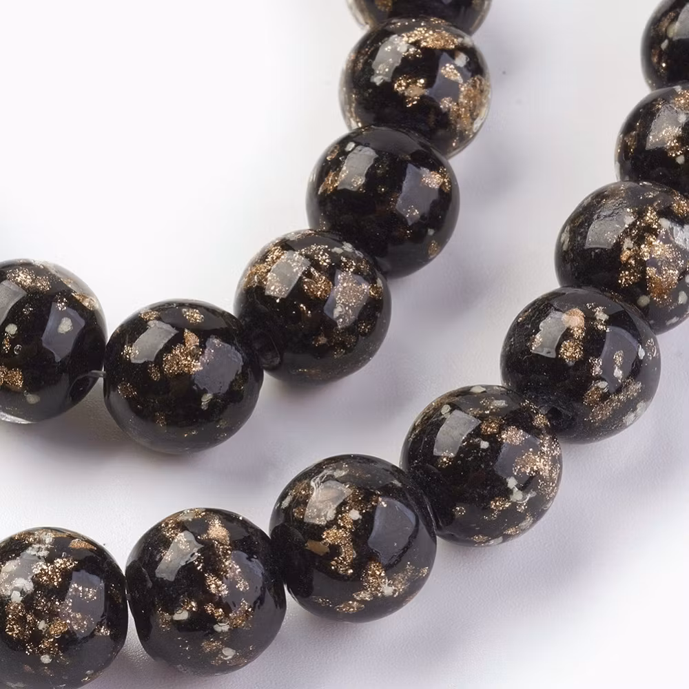 Lampwork i svart och guld 10mm 40st på en sträng. Hål 1,2mm så vackra