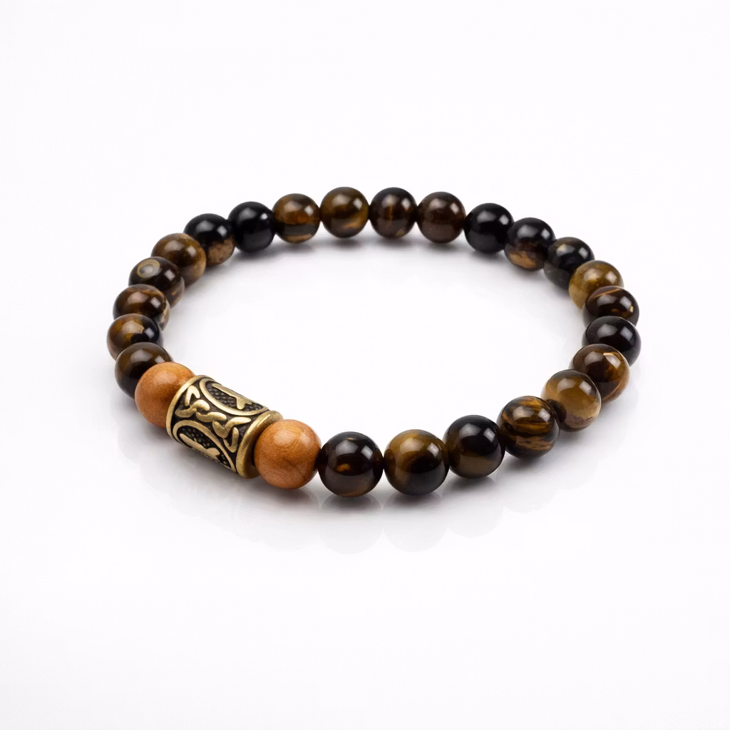 Armband i tigereye kristaller ä, teäpärlor och en stor berlock i rostfritt stål.