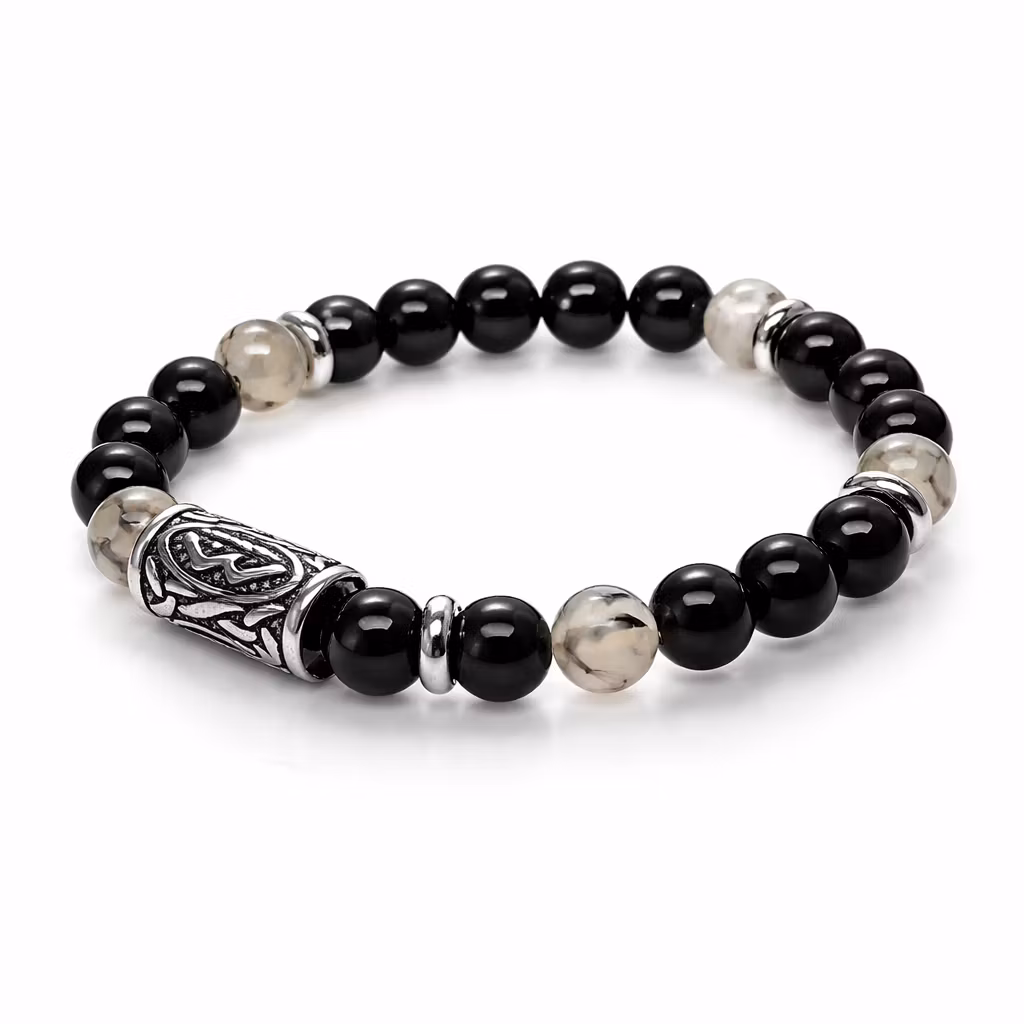 Armband med dragonagater ( kristall) och glaspärlor. Stora pärlan är i rostfritt vikingamönster