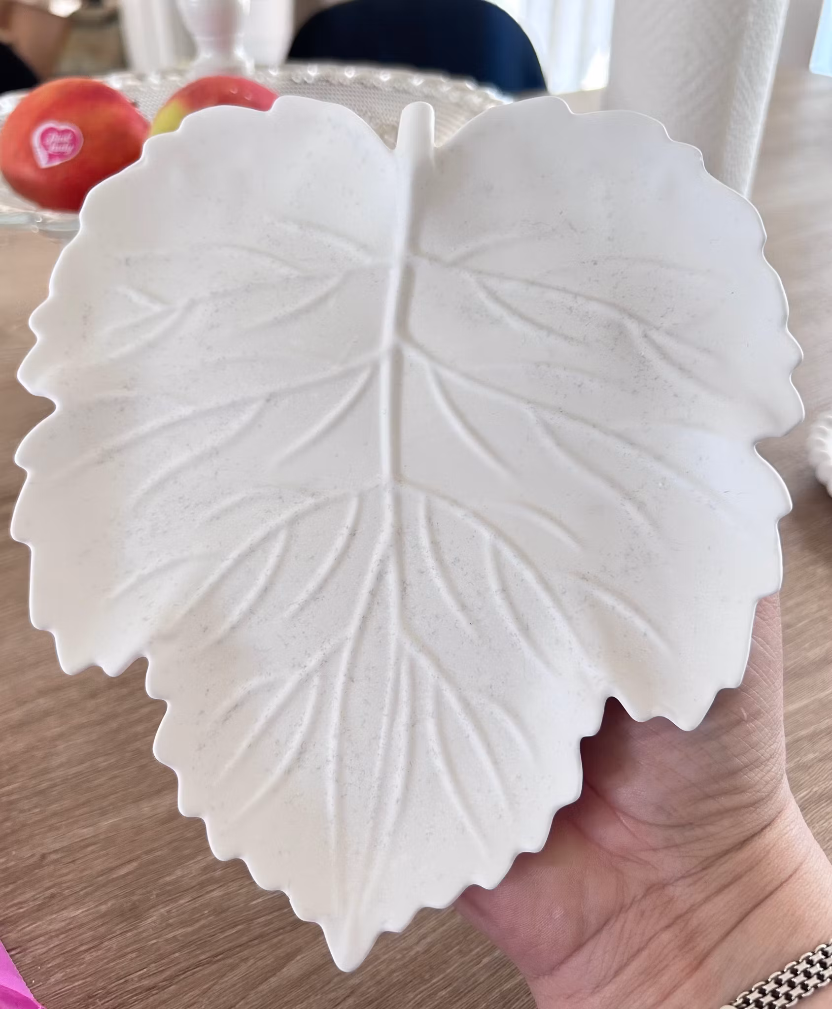Så vacker!! Hårt porslinsliknande material som vaxas. Tål att torkas av med fuktig trasa. Lite matt utseende. Faten är handgjorda och därför varierar utsee