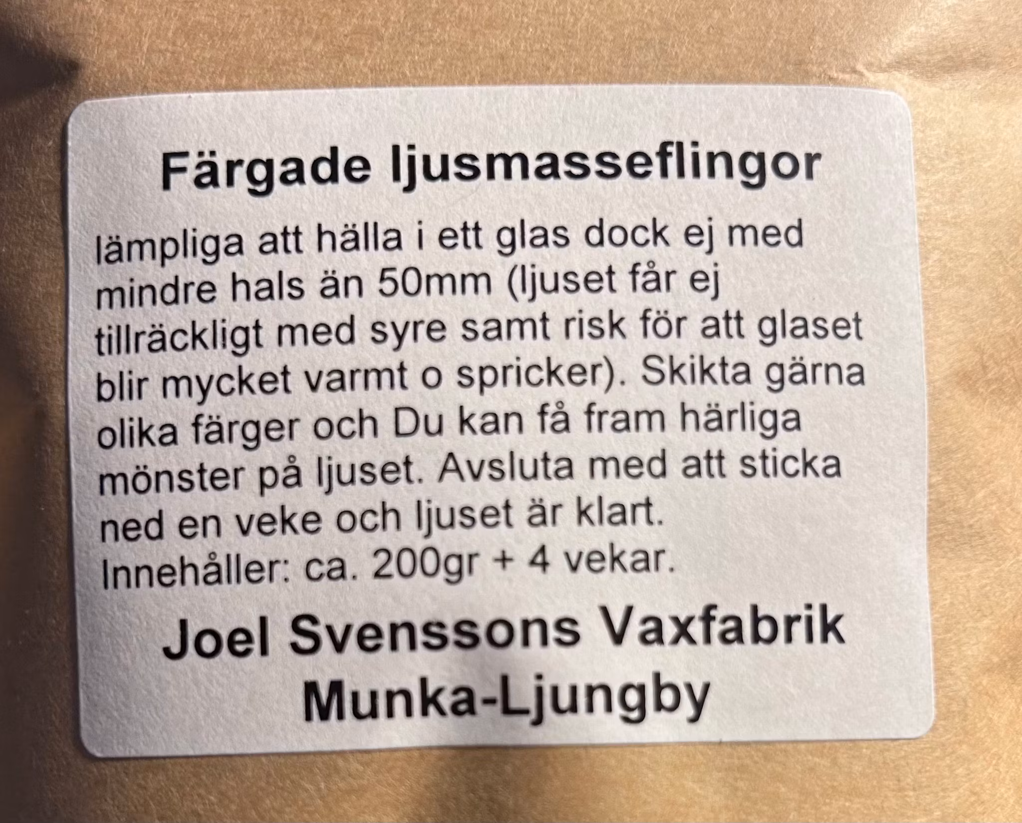 Läs bifogad text före användning.Paketet innehåller 200g ljussand och 10st ljusvekar