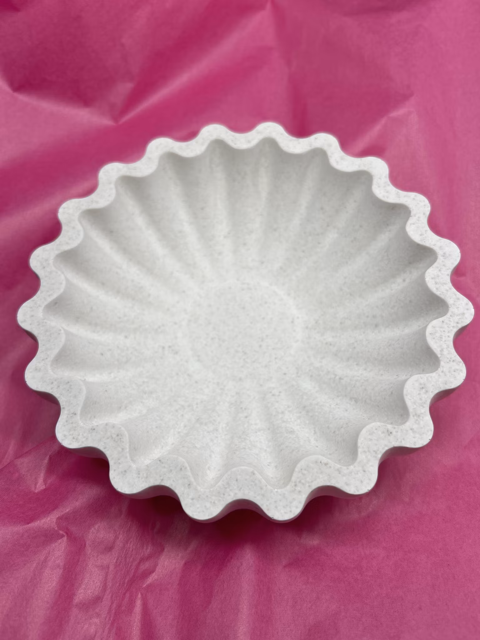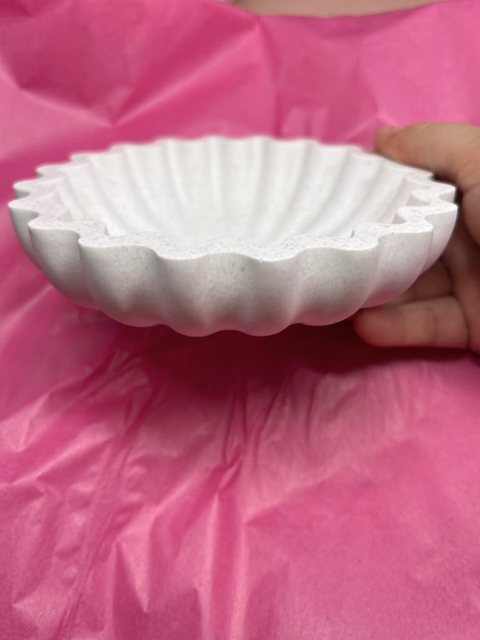 Skål i iredningsgips och är 16cm i diameter. Skålen är vaxad och tål avtorkning med fuktig trasa.
